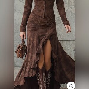 A modern take on vintage romance, this brown maxi dress is designed to move beautifully with every step. Crafted from a soft, draped fabric, it features a fitted button-front bodice that defines the waist, flowing into an asymmetric ruffle hem that creates effortless movement and drama.