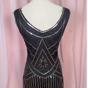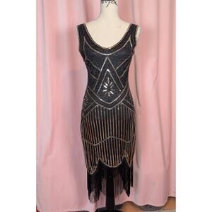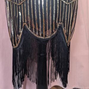 Retro Sequin Flapper Dress with Fringe Black and Gold Small