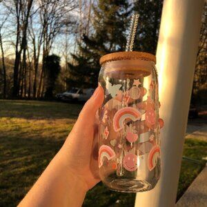 Retro Smiley Face Rainbow 16 oz Glass Cup NEW
