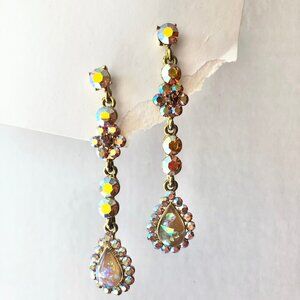 Retro So Good Gold Topaz Faux Opal Drop Earrings Iridescent Rhinestones