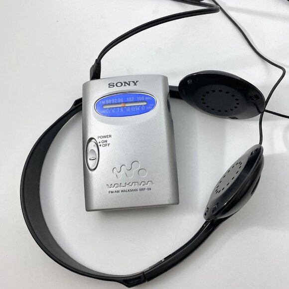 Classic Sony Walkman AM/FM Radio SRF-59 with original black headphones and belt clip. It's from back in the day, about the mid 1990's. It's in great condition and comes all ready to use with a new AA battery. The headphones no longer have their foam cushions but they work just fine without them. The radio is 3 1/2" x 2.1/2". Nice collectible and a fun gift idea.