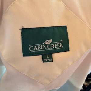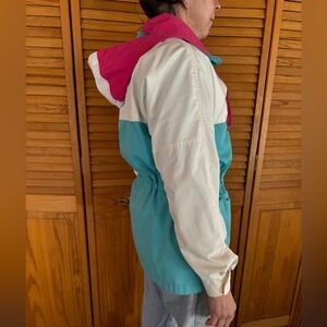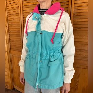 Retro Spring Jacket | Vintage | Zipper and Snap Buttons | Two front pockets | Collared | Hood | perfect for spring rain | Brand: Cabin Creek | Size: women’s small 6-8 | great condition | one small mark on the side of the coat (pic 5) and 3 pencil point dots on the back of the coat (pic 8)