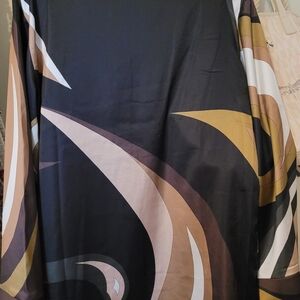 Chic dress with a V-neck design. Features a swirl pattern in black, brown, and gold. can be worn as a dress, a beach or poolside cover up, lounge around the house- or wear on Halloween wth a headband & platform shoes