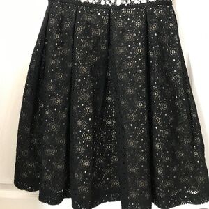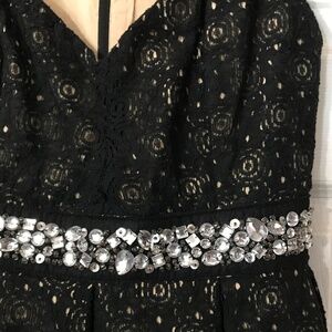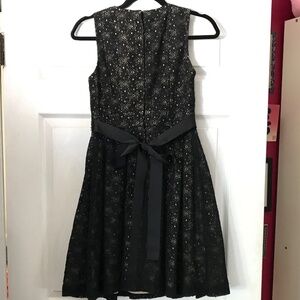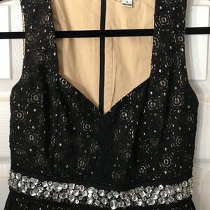 Retro cocktail dress by Monteau. Size Small. Purchased from ModCloth. This is a beautiful well made dress and it was only worn a couple times. Good quality black lace over beige cotton lining. Fitted on bust and waist with full skirt. Sweetheart top and beading & gems at waist. Tie at waist in back with black ribbon.