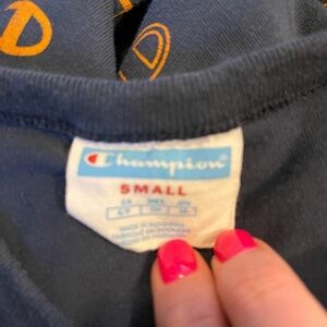 Retro StyleChampion Logo Crew Neck Tee Size Small Navy with Orange All Over Logo