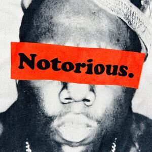Excellent vintage condition. Features the iconic crown portrait of Biggie Smalls with bold red “Notorious.” block lettering across the eyes. Tag reads The Notorious B.I.G., worn-in single stitch style with soft vintage fade.