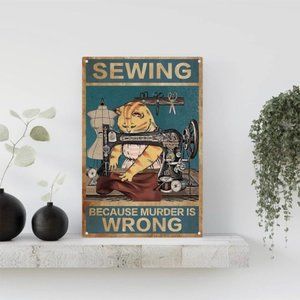 Retro Tin Sign, Cat Sewing Because Murder is Wrong Wall Sewing, Poster 8x12"
