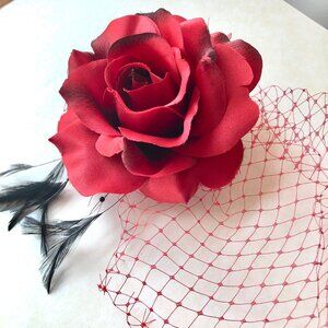 Red Net Detail, Beaded Feathers, Soft Black Trim Petals, Alligator Clip Attachment