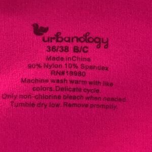 Retro bright pink and black sports bra by Urbanology. This sports bra has a pink, almost neon-like body, with black trim and a black bottom band. It has underwire cups and a racerback. It is pre-owned with very light pilling and a small snag on the front left, by the cup.