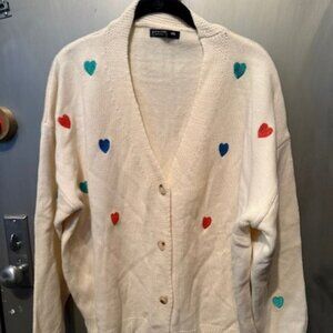 Color: Cream / ivory sweater with multi colored embroidered hearts
