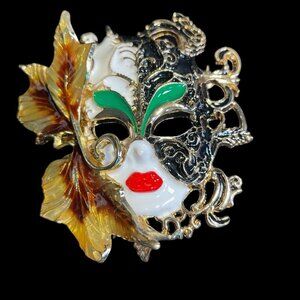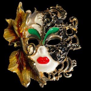 This stunning vintage Venetian mask brooch features an intricate filigree gold-tone design with beautifully detailed enamel accents. The dramatic masquerade mask is adorned with elegant green, black, white, and red enamel, giving it a bold and artistic look. A large golden leaf accent adds a unique, baroque touch. This statement brooch is perfect for collectors, costume lovers, and those who appreciate unique, theatrical accessories.