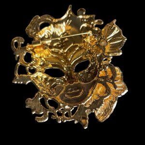 vintage brooch, masquerade pin, venetian mask, carnival jewelry, gold tone brooch, enamel pin, filigree brooch, statement brooch, baroque style, theatrical costume, collectible jewelry, gothic jewelry, unique gift, mardi gras accessory, artistic jewelry