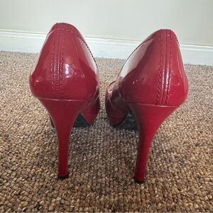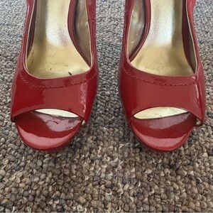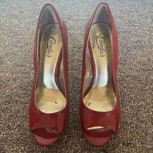 Retro, Vintage Candie’s Candy Apple Red Peep Toe Pump Open toe leather w heel