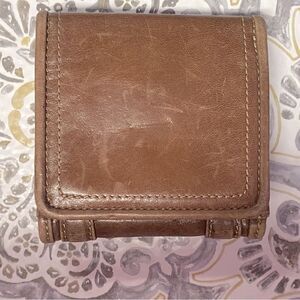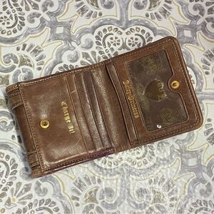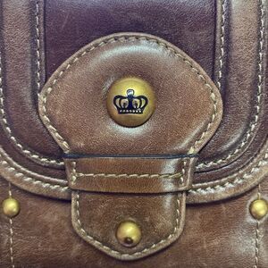 Made from 100% genuine brown leather with brass hardware. Open the flap for places to keep your id and cards, plus a pocket for cash. The backside is a snap to close coin pocket. Features juicy couture repeating initials on the inner fabric.
