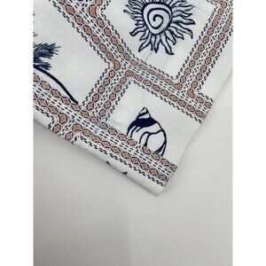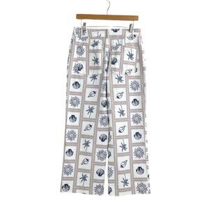 These vintage-inspired women's wide-leg pants showcase a coastal beach motif, blending seashells, sunbursts, and palms in a clean white and navy aesthetic. Crafted from breathable cotton.