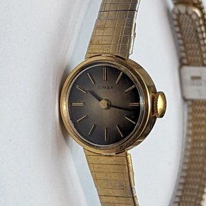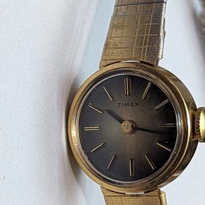 Antique watches are back on style....! Fun! and Collectible! TIMEX Black DIAL and Gold markers as numbers cute and delicate look and design. Acrylic face, minimal wear with magnification.. This pictures are taken with HD camara, for your view...Age marks will be less visible at normal eye sight. Wrist band is adjustable can fit any wrist from 4" up to 7" max Bracelet Band thin 14mm This Watch does not required batteries, wind up mechanical, and is working smooth. ~44~