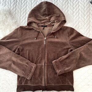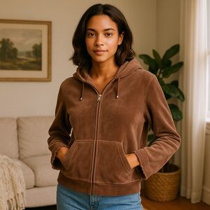 Channel major early 2000s vibes with this soft and cozy Daisy Fuentes velour zip-up hoodie in a warm mocha brown. This jacket combines plush comfort with feminine detail, featuring: