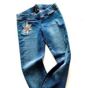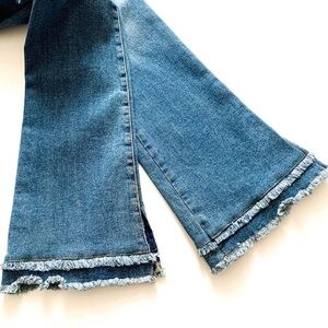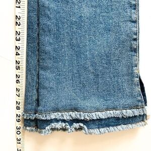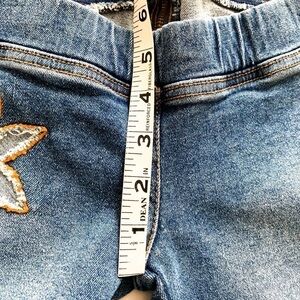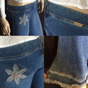 Waist hits at hip. Double layered frayed split cuffs. Flower patch on front and back. Back zip. Low waist 34" Hip 35" Rise 6” Inseam 29.5” best for a 23-24 in Denim. Extremely HTF and unique .