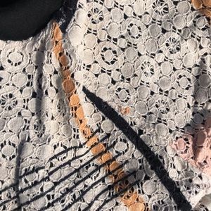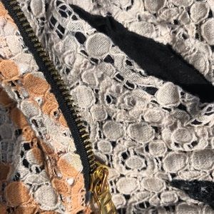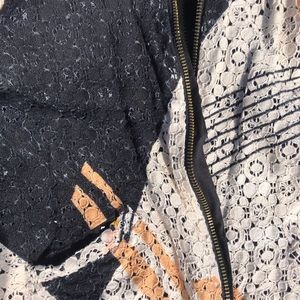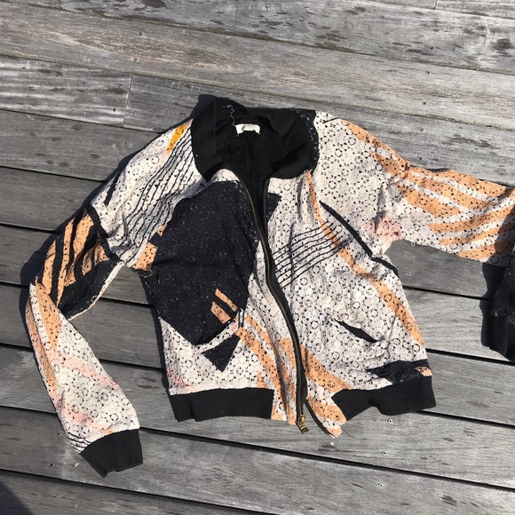 I love this zip up! Double layer, so it’s surprisingly soft on the inside. The outer design is intricate and retro- a friend described it as “Grandma’s doilies meets 80s Hip Hop”. A very unique design with the combination of lace like design with abstract shapes. Not brand new but no major rips tears or wears. Just a few threads around the neckline. Great as a throw over or as a zipped up top on its own. Party!