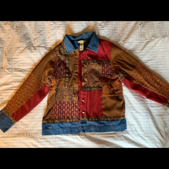 Denim patchwork jacket. The brand bechamel was sold at Dillard’s and is no longer available. It exists as thrift clothing only nowadays!