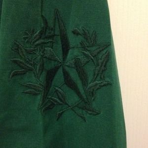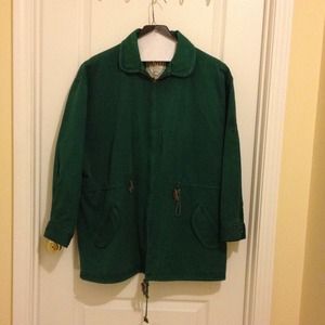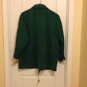 Cuffed, zippered. Drawstring cords with leather tabs at waist and bottom. 100%cotton. Label says this is washable but I have always dry cleaned. Delicate embroidery on upper left arm sleeve.