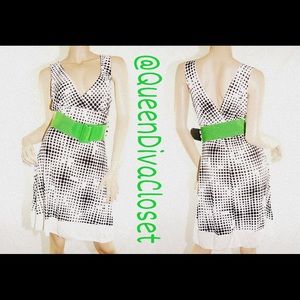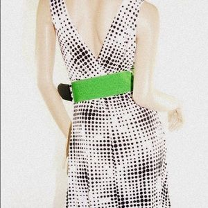 This fabulous dress is figure flattering with that feminine flare! Features a surplice wrap style bust, and a neon green belt for a pop of color! This dress is lined.