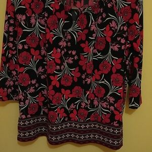 Shades of red, black, and white flowers with a band of paisley design on the bottom..slits on the bottom of both sides
