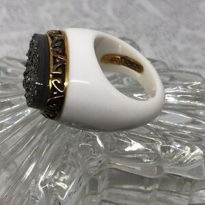 Feels like white porcelain, however I could be wrong. Druzy center with sterling silver metal around. Note the sterling silver was gold plated but it got tarnished.