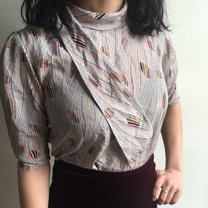 60s Vintage top with wrap around collar, Multi colored pattern goes with everything. Very thin shoulder pads for the silhouette.