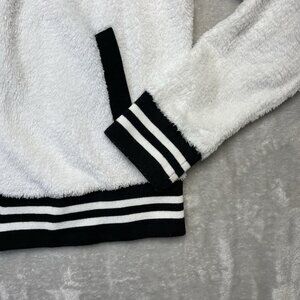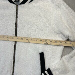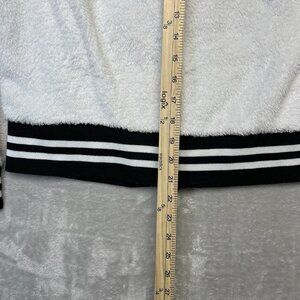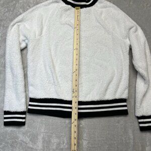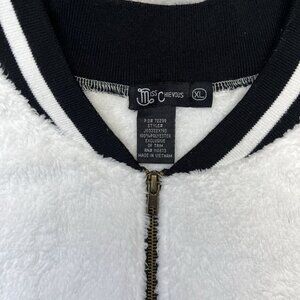This retro varsity bomber jacket by Miss Chievous is a stylish and cozy outerwear piece for women. The bright white fluffy fuzzy fleece fabric gives it a unique and eye-catching look, perfect for adding a touch of retro flair to your outfit. The jacket features a collared neckline, full zip closure, and pockets for added functionality. With accents like the zipper and varsity style, this jacket is a fun and trendy choice for those who appreciate a nostalgic college-inspired aesthetic.
