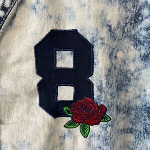 Unique acid wash style shirt featuring “Rose 8” on the front and back. It measures 21 inches armpit to armpit laying flat and 28 inches in length from shoulder to hem.