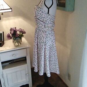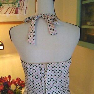 Adorable satin dress with chocolate and strawberry polka dots. Back zip, elastic at back top. Ruched bodice with ties around neck. Full skirt. No tags. See measurments. Measures 34 at chest, 28 at waist, full skirt, 39 long from shoulder to hem. Very Old Hollywood, pin up retro, and FUN.