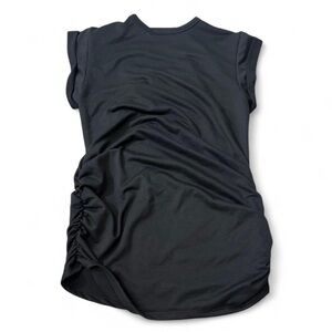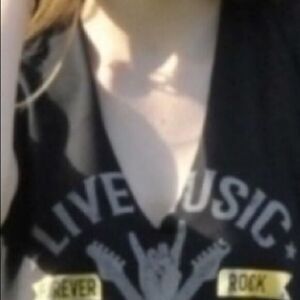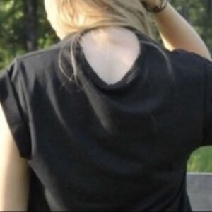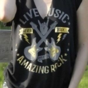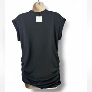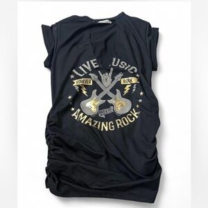 Retro Look Graphic Tee. Extremely high quality tee with rolled sleeves. Cool gold foil against black body with a ripped look v neck. Also features ruche sides for good fit. Back has cutout just below neck.
