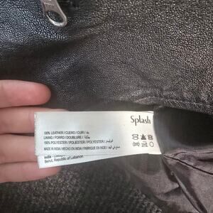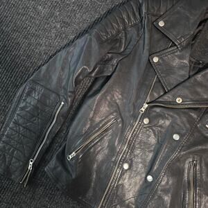 black leather, biker jacket, goth style, distressed, stud accents, zip-up, motorcycle-inspired, fitted, edgy, alternative fashion