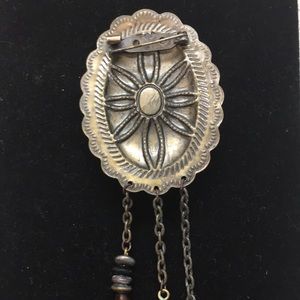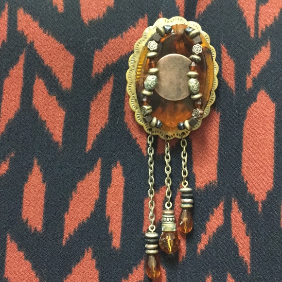 Lustrous amber resin oval set in base metal alloy scalloped pin. Bar pin on back. Plastic amber beads hang on 3 chains at the base. A convincing knock off of an expensive antique! Statement fashion pin. Pin is 2” long (excluding chains) x 1.75” wide.