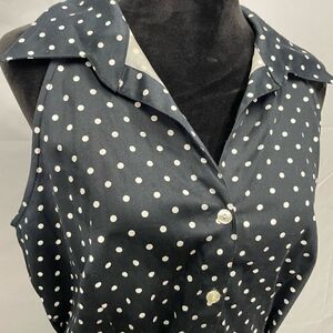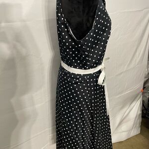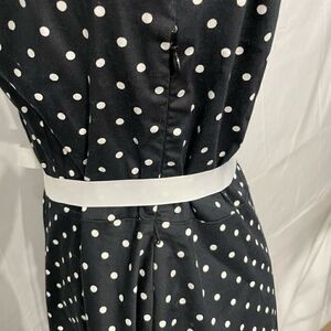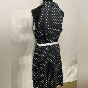 Cute diner style dress! Has some stretch, side zipper and ribbon belt. In good used condition- one makeup stain on the inside of the dress but does not affect wear.
