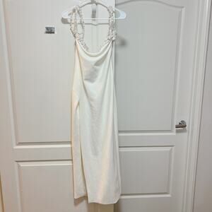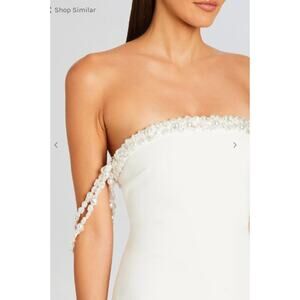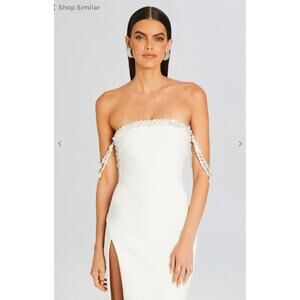 Brand new with tags, Retrofête Abilene dress in white. This elegant off-the-shoulder maxi features intricate hand-stitched pearl embellishments, allover sequins, and a daring thigh-high slit for movement and drama. Designed with non-slip rubber binding to secure the neckline, and a hidden side zip with hook closure for a seamless finish. Crafted from a stretch crepe blend (93% polyester, 7% spandex) with full nylon lining.