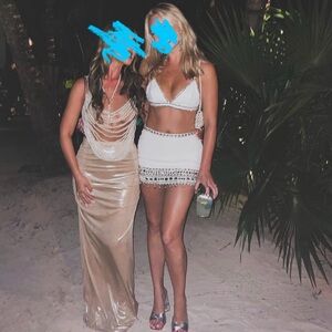 The top was altered on the straps (extra material with gems included) to pull up chest instead of sitting on top - the straps were weirdly long when I got it. I’m a 32D for reference and usually wear size small or 2/4