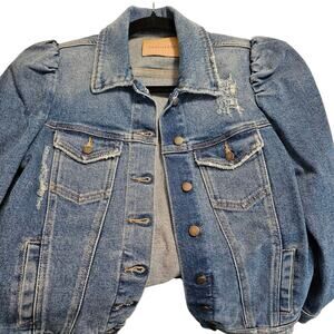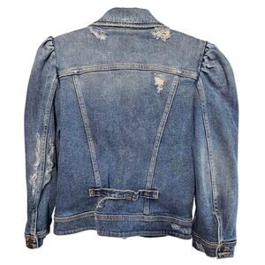 Retrofête Ada Puff Sleeve Pad Shoulder Denim Jacket – Women’s Size Small – Distressed Vintage Blue Jean Jacket