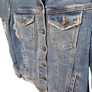 Crafted from high-quality cotton denim, this jacket features padded shoulders for a strong, defined shape and puff sleeves that add a feminine, dramatic flair. The distressed detailing on the front, sleeves, and hem gives it a worn-in, vintage aesthetic perfect for layering over dresses, tees, or crop tops.
