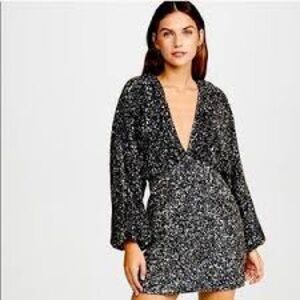 Shine bright in the Aubrielle Dress, an effortless cocktail silhouette. Characterized by its hand-stitched sequin embellishments, the mini dress boasts a plunging neckline and oversized draped sleeves.The design features an invisible back zip closure.