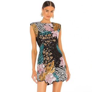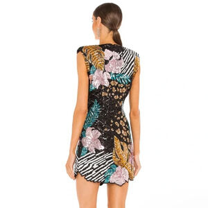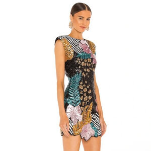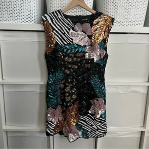 Stunning mini dress with bold floral patterns. Features black, gold, pink, and teal colors. Perfect for a night out.