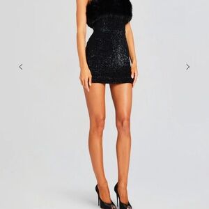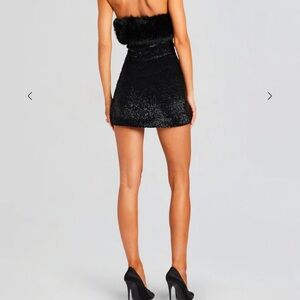 Stunning sequin mini dress with strapless neckline. Features pink feather trim. Ideal for glamorous events.