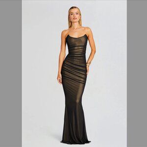 Elegant strapless maxi dress. Features a sleek silhouette. Perfect for evening events.