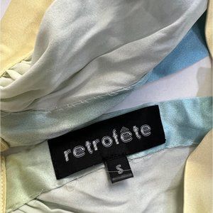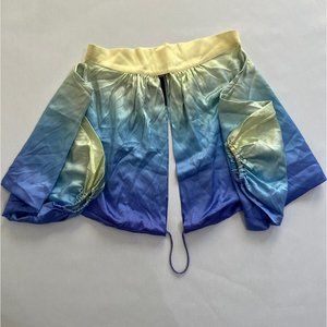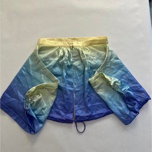 Stylish ombre crop top. Features blue and yellow hues. Deep V-neckline. Long sleeves with elastic cuffs. Perfect for a chic look.