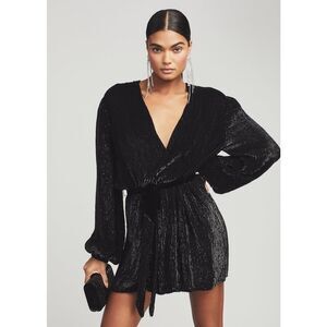 Introducing the ultimate party frock: The Gabrielle Robe. Enveloped in hand-stitched sequin embellishments, this timeless silhouette features a wrap bodice, which is complemented by voluminous blouson sleeves and a velvet tie belt to cinch the waist. For a micro mini moment, we recommend sizing down. Shown here in Black.