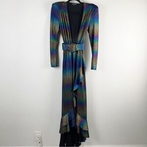 Padded shoulders, Long sleeve, maxi length, plunge v neckline, removable belt, ruffle detail, metallic. Blue, green, purple. Stretchy poly, spandex blend. Cocktail, party, event, night out, semi formal, wedding guest, date, evening, gala, black tie, rainbow.