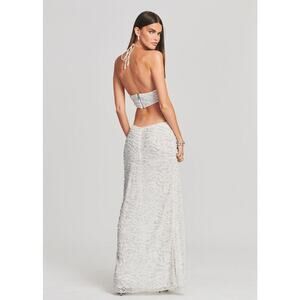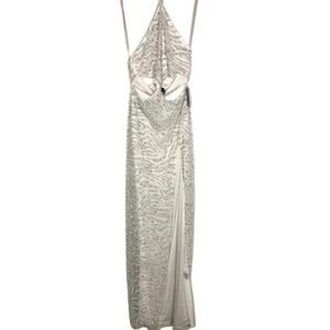 Crafted with a halter tie neckline, final details include dramatic side cut-outs, and a slit on the skirt