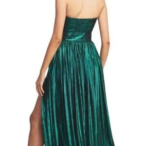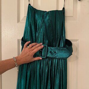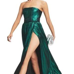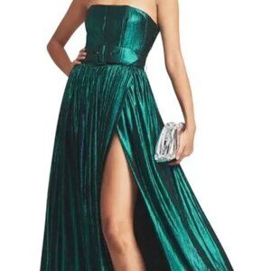 Designed in a strapless metallic bodice, the silhouette is corseted for shape and support. A matching velvet belt draws in the waist, while a voluminous skirt glimmers with every move. This dress features and invisible side zip closure.