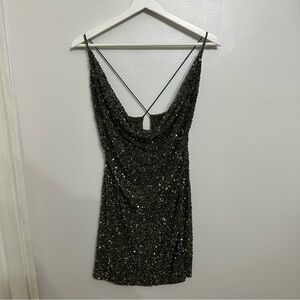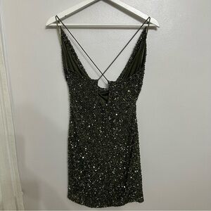 Say yes to a good night out in our Mich Dress. The sequin-embroidered spaghetti strap mini dress, drapes effortlessly over your body and features a cowl neckline. Shown here in Olive Green.